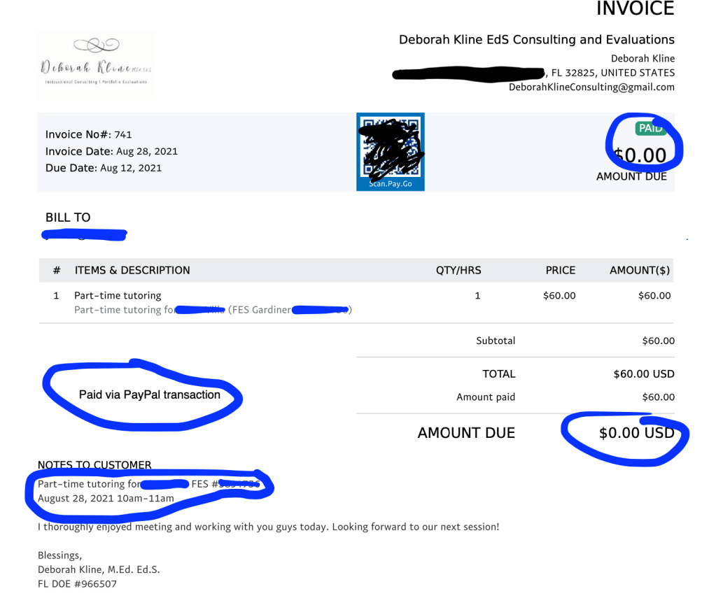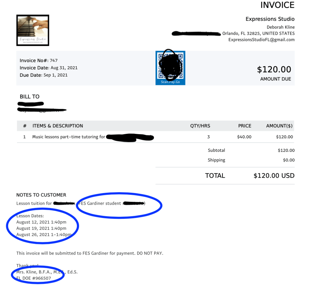 Many FES families enter the scholarship already using credentialed tutors who are not familiar with the program. For those wonderful teachers with whom you wish to continue to work, please instruct them to submit regular invoices with the following information to ensure your reimburse goes through quickly.