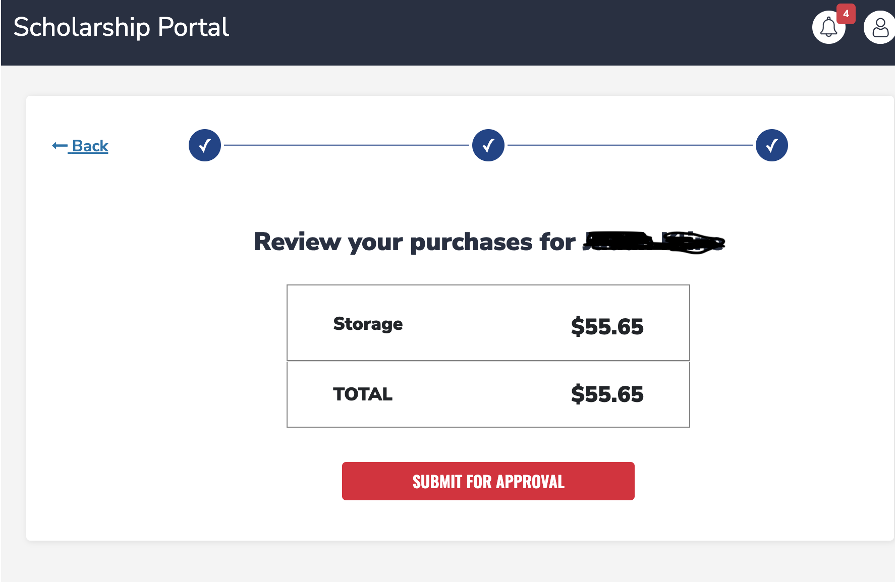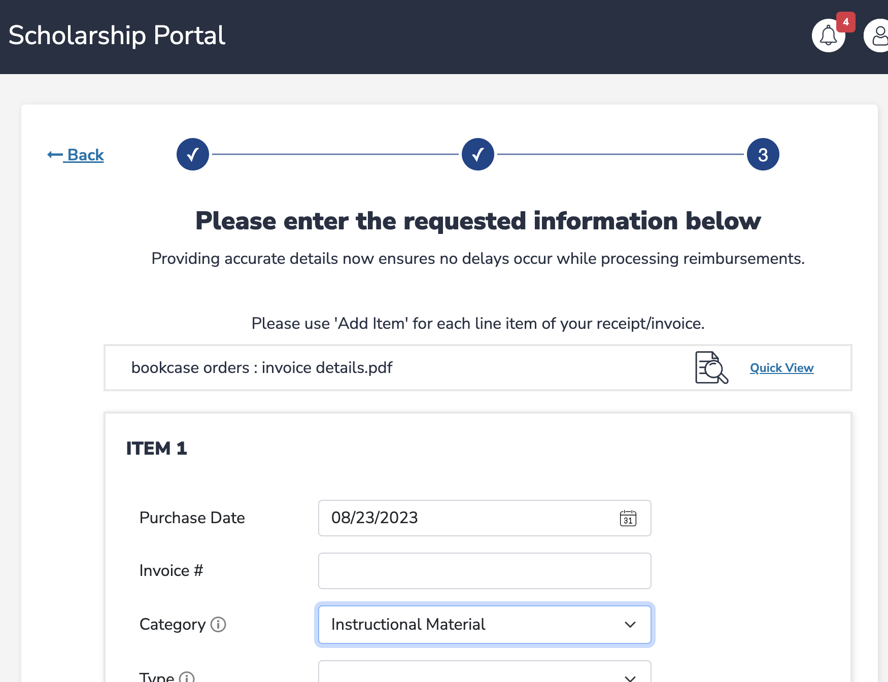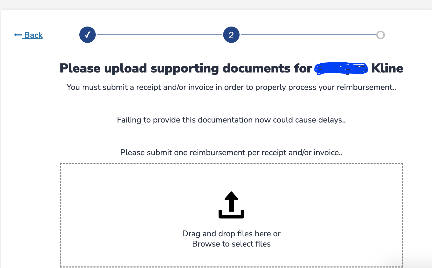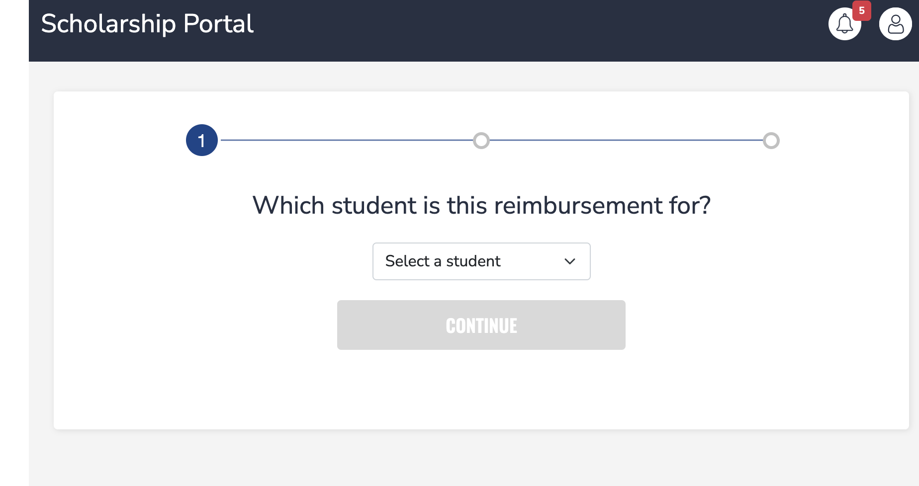 4. Choose Student (if applicable) and UPLOAD your initial receipt. There will be a chance to add supporting documentation later.